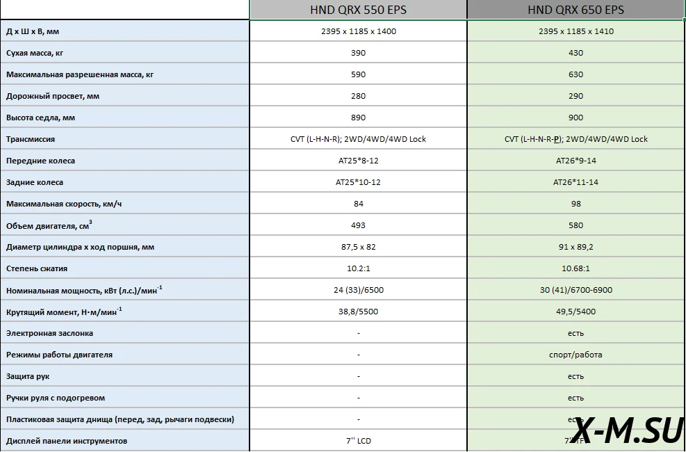 Квадроцикл произведён на современном заводе по технологическим процессам, разработанным совместно с компанией Yamaha. Модель оснащена 33-сильным 1-цилиндровым двигателем на 25-дюймовых колёсах. В базовом оснащении HND QRX 550 включены: система впрыска топлива BOSCH EFI, электроусилитель руля (EPS), электронное управление газом с выбором режимов езды, большая TFT-приборная панель диагональю 7 дюймов, лебедка с тягой до 1,5 т (3500 LBS), комфортные 2-местные сиденья и бензобак на 22 литра.